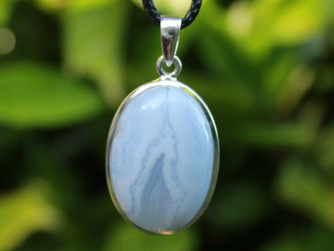 Chabochon van Blue Lace Agaat gezet in 925 Zilver. Inclusief zilverkleurige ketting van 45cm.