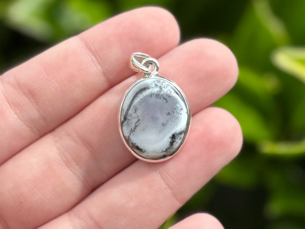 Cabochon van Dendriet Agaat, gezet in 925 zilver. Inclusief zilverkleurige ketting van 45cm.