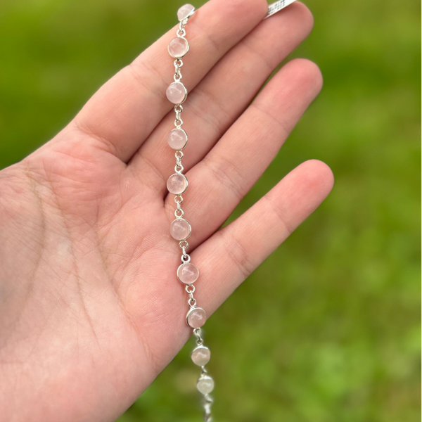 Unieke armband met 11 geslepen ronde Rozenkwarts cabochons van 925 Zilver.