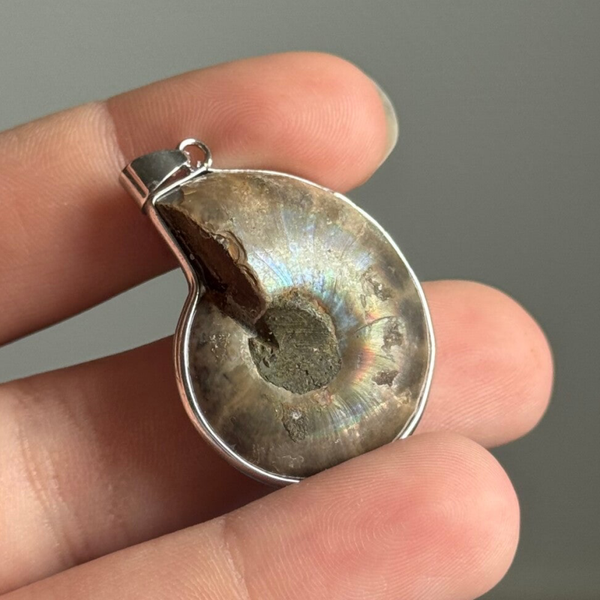 Unieke hanger van gefossiliseerde Ammoniet! De achterkant is irriserend!