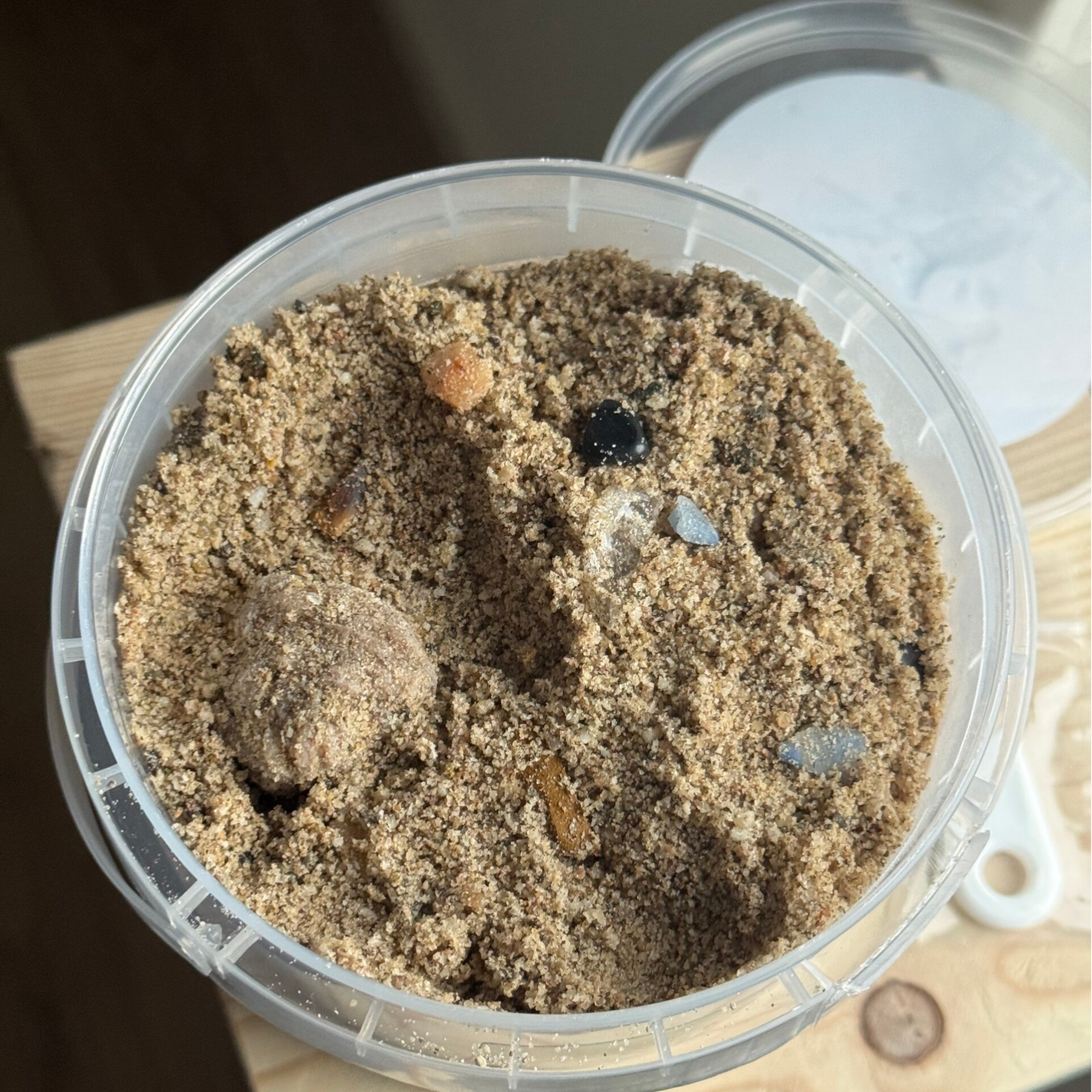 - Emmertje van ca. 1,3kg met zand & ruwe edelstenen en fossielen