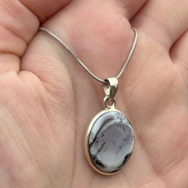 One of a kind hanger van Dendriet Agaat gezet in massief 925 zilver. Inclusief Stainless Steel halsketting.