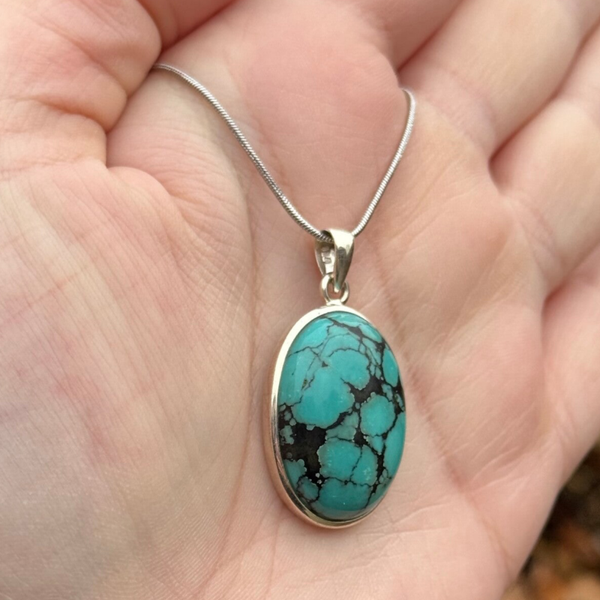 One of a kind hanger van Turkoois gezet in massief 925 zilver. Inclusief Stainless Steel halsketting.
