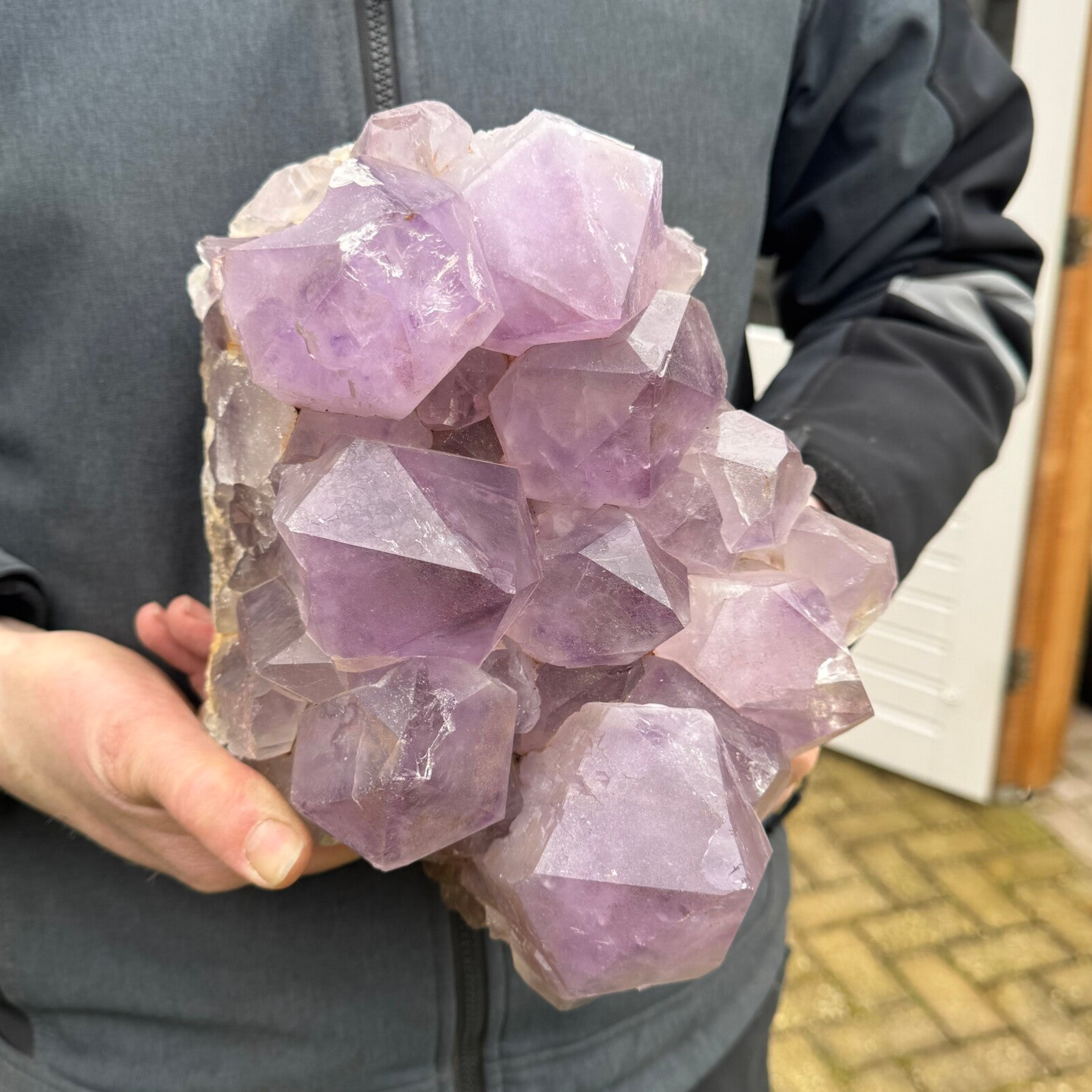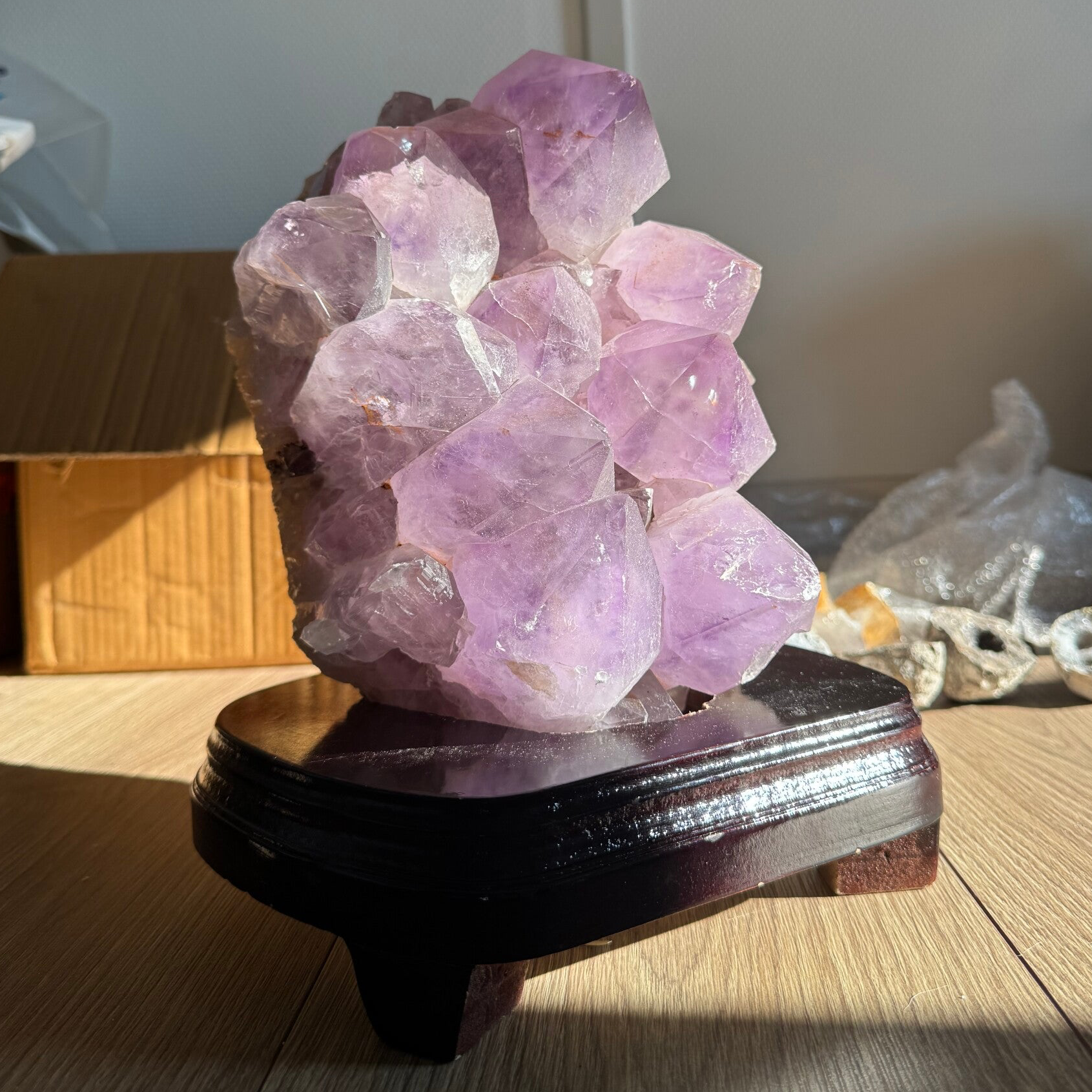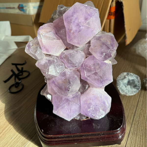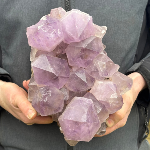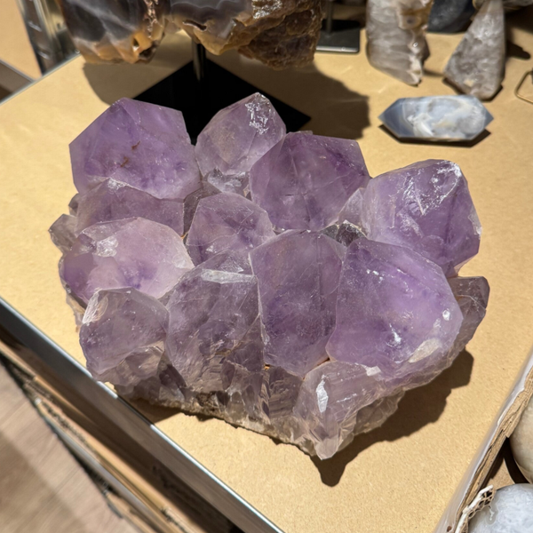 Deze mooie cluster met mega unieke punten is ca. 16cm hoog, 25cm breed/lang en weegt ongeveer 7 kilogram. Ook komt ze met een gratis standaard, mocht je haar rechtop willen neerzetten.